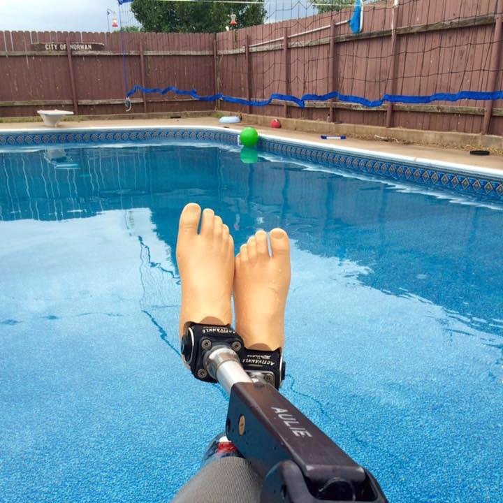 Протезист построил ей пару ног для плавания с возможностью фиксации лодыжек в позиции для гребка, когда не нужно было ходить. Если пытаться плавать с ногами, у которых ступни зафиксированы под углом 90 градусов, то гребок ногой потянет назад, вместо того, чтобы толкать вперед. Было много сделано проб и ошибок. Несколько дорогих ног разрушились после того, как оказалось, что в действительности они не были уж такими водонепроницаемыми. Один из протезов находится на дне озера Тандерберд, после проблемы с внутренней прокладкой.