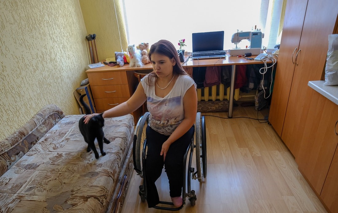 Окно, тахта, рабочий стол со швейной машиной, скромный набор бытовой техники и телевизор. В этой комнате прошли последние полтора года Лениной жизни. В отсутствие пандуса она не может самостоятельно покинуть стены общежития — за все лето Лена ни разу не побывала на улице. Вывезти девушку на прогулку способен только взрослый мужчина, а их в окружении не много. Из родственников в Лиде осталась только двоюродная сестра, с соседями дальше «здравствуйте» разговоры не складываются, социальная работница помогает сироте в быту, но не особо интересуется ее жизнью. Впрочем, заключение в четырех стенах для Лены не ново: из-за проблем с позвоночником она с детства была отрезана от общения со сверстниками и, выражаясь фигурально, выросла взаперти.