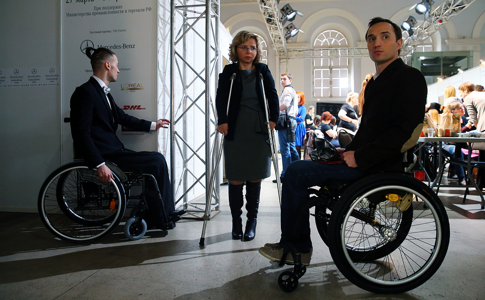 Россия. Москва. 31 марта. Подготовка к выходу на подиум во время показа коллекции «BezGraniz Couture» для людей с особенностями строения фигуры и потребностями, продиктованными инвалидностью в рамках Недели моды Mercedes-Benz Fashion Week в ЦВЗ «Манеж». Фото ИТАР-ТАСС/ Сергей Бобылев