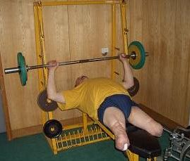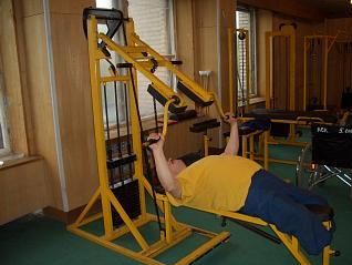 Для тренировки мышц плечевого пояса и мышц плеча выполнялось следующие упражнения: сгибание-разгибание в локтевых суставах на тренажере «для развития двуглавой мышцы плеча»; одновременно или попеременно обеими руками приведение-отведение плеча на тренажере «для развития мышц плечевого пояса»; приведение-отведение плеча, сгибание-разгибание в локтевых суставах на тренажере «эспандер грузовой»; жим гантелей в положении лежа на горизонтальной или наклонной скамье; жим штанги в положении лежа на горизонтальной или наклонной скамье; сгибание-разгибание рук в упоре на брусьях консольных; движения в плечевых и локтевых суставах, растягивая пружинный эспандер; разгибание, сгибание, приведение — в плечевых суставах, сгибание-разгибание в локтевых суставах на тренажере «для развития икроножных мышц»; одновременное или попеременное сгибание-разгибание в локтевых суставах, удерживая гантели в положении сидя на кресле-коляске.