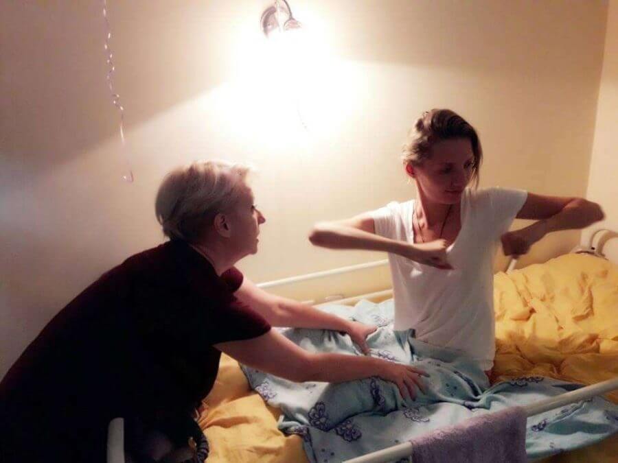 Лишившейся в аварии ног девушке помогает волонтёр, пережившая подобную автокатастрофу
