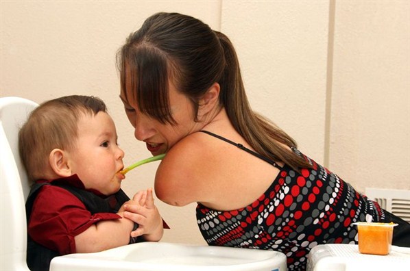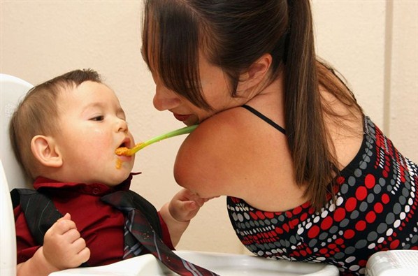 Тщательно зажав ложку между подбородком и плечом , Венди наклоняется вперед, чтобы накормить своего восьми-месячного сына Джереми.