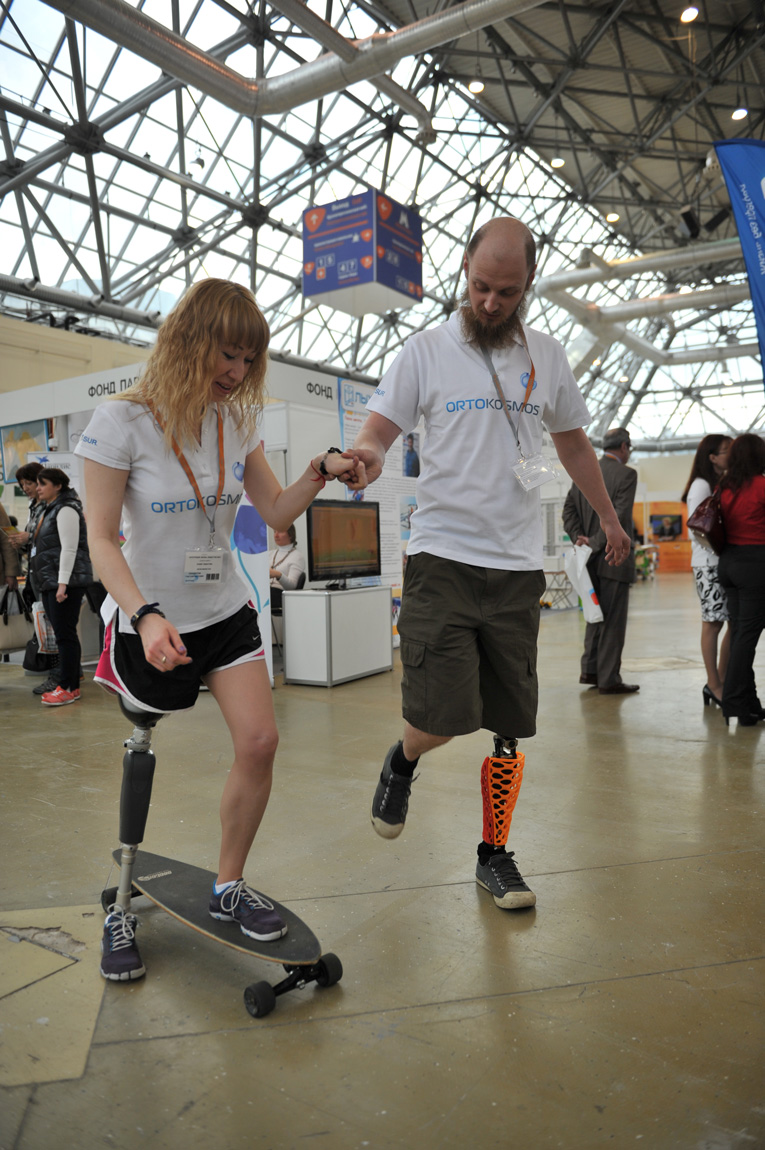 Ещё одну новейшую мировую разработку представил российский парасноубордист Серафим Пекалов. Он привлекал посетителей выставки, катаясь на скейте на протезе с ярко-оранжевой облицовкой. По зеркальному отражению здоровой ноги форму утраченной напечатали на 3D-принтере. Дизайн — фантазия заказчика. «Любая косметика, скрывающая протез, — это всё равно не нога, — рассуждает Серафим. — Поэтому, зачем пытаться имитировать ногу? С возможностями 3D-принтера я могу придумывать для своего протеза разные расцветки и фактуры. Это очень круто. У меня уже куча всяких идей».