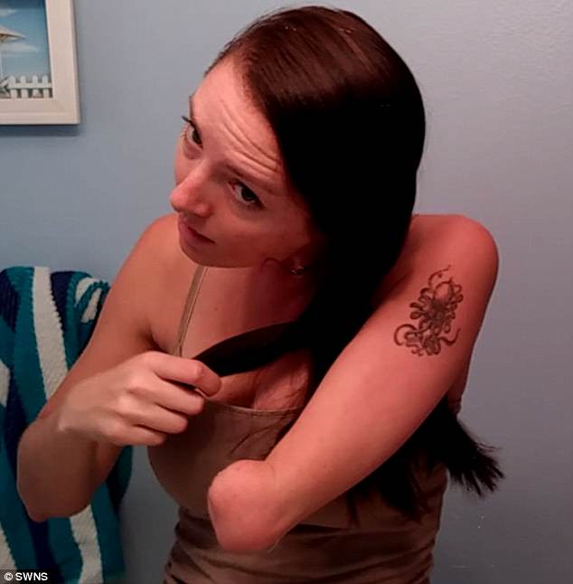 У Эшли есть бионическая рука, которая помогает ей в жизни и которую она надевает, используя свои колени.
