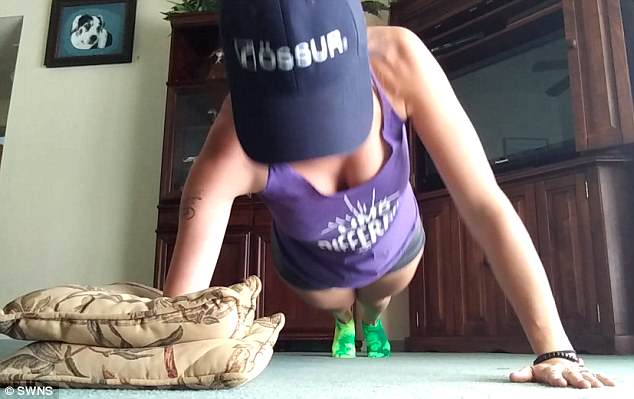 Чтобы отжиматься, Эшли использует подушки, давая дополнительную высоту с правой стороны, благодаря этому ее левая рука отличается какой-то сверхмощной силой.