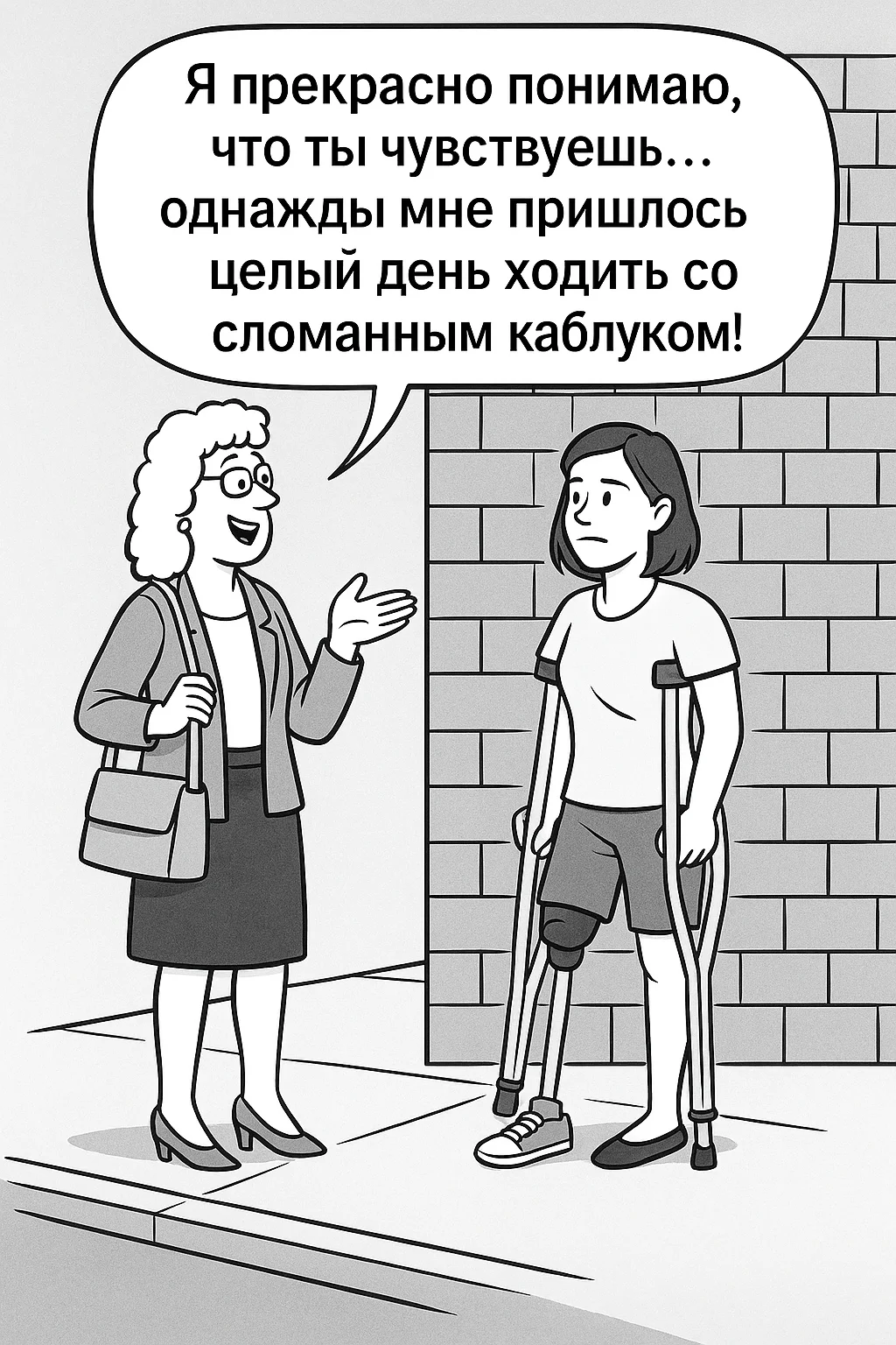 Этот чёрно-белый комикс в сатирическом стиле изображает типичную, но неловкую ситуацию, в которой сочувствие звучит неуместно. Женщина на двух ногах с энтузиазмом говорит другой женщине, у которой ампутирована нога и которая стоит на костылях: